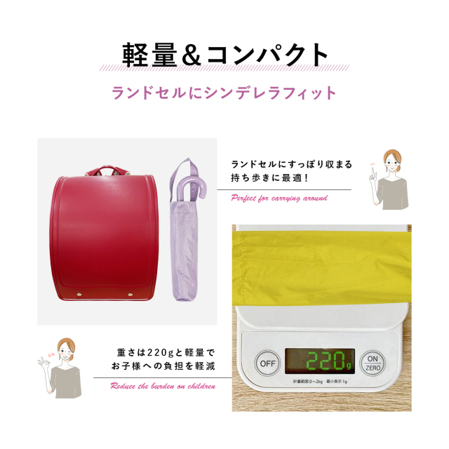 ランドセルにすっぽりとシンデレラフィットし、重さも約220gで毎日持たせても苦にならない。